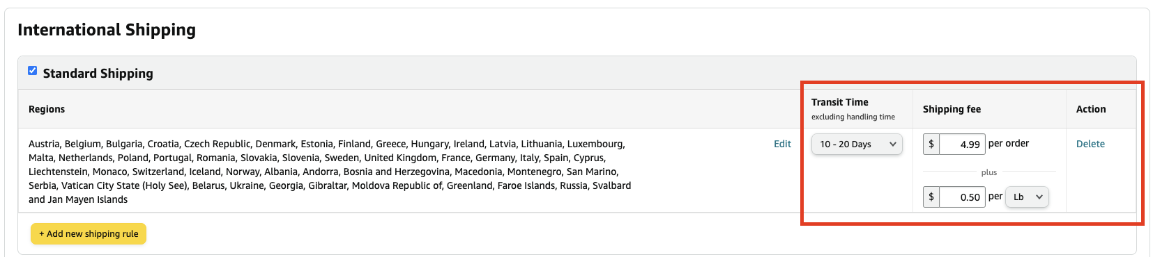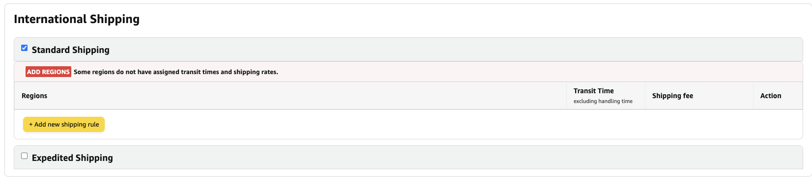 4. 選擇“international standard shipping”(國際標(biāo)準(zhǔn)運(yùn)輸)并添加新的運(yùn)輸規(guī)則